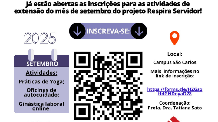 O projeto de extensão “Respira Servidor” está com as inscrições abertas para o mês de setembro. As atividades estão no 5° módulo e são modificadas mensalmente, sendo realizadas presencialmente no campus São Carlos com duração de maio a novembro deste ano. O cronograma do mês de setembro conta com duas práticas de yoga e duas […]