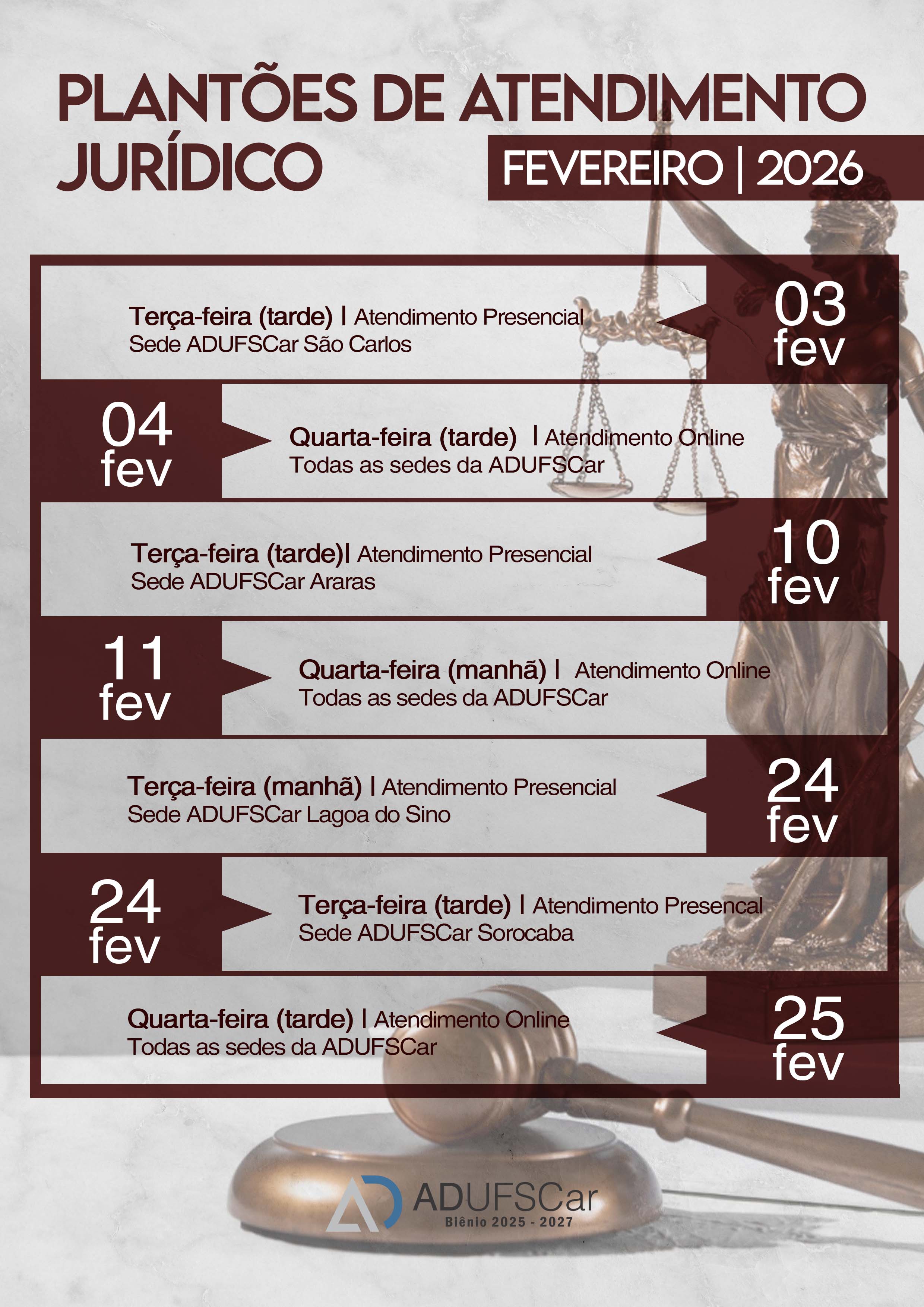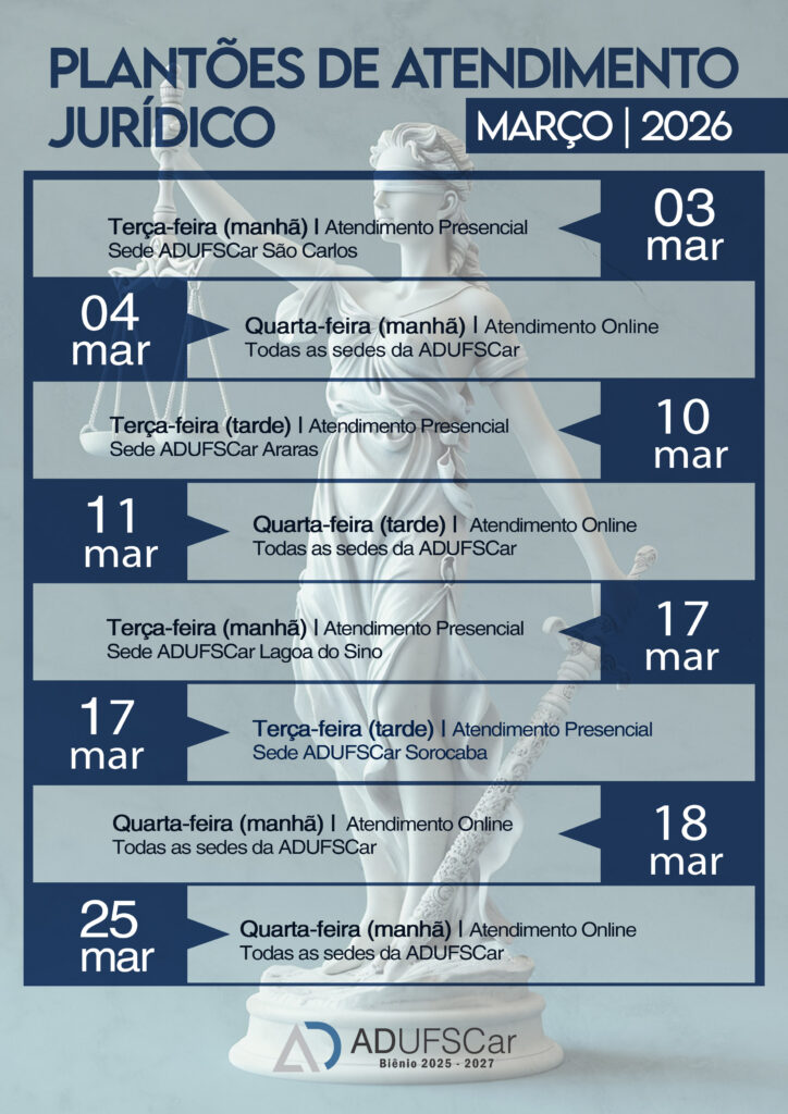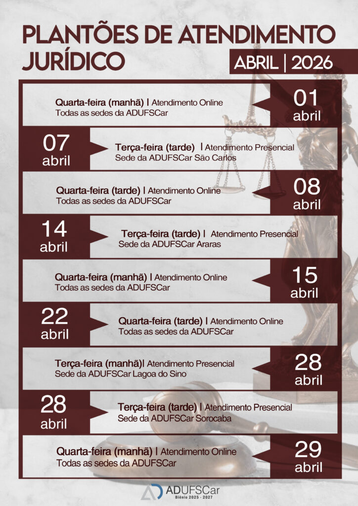 Os atendimentos são realizados todas às terças-feiras presencialmente – com visitas mensais a todas as sedes da ADUFSCar, mediante agendamento – e às quartas-feiras de maneira virtual.