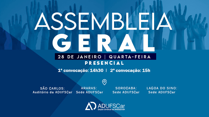 CONVOCATÓRIA | Assembleia Geral da ADUFSCar, presencialmente, no dia 28 de janeiro de 2026